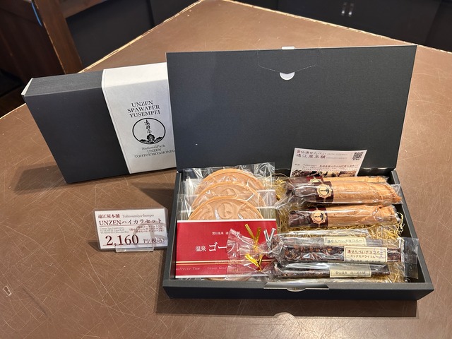 雲仙銘菓湯せんぺいのアレンジ商品の詰合せセットです。 ・温泉フレット 3枚(リッチクリーム/雲仙茶クリーム/シナモンクリーム) ・湯せんぺいシガーロール 3本 ・湯せんぺいチョコバー 3本(きんかん 2本/ミックベリー&シナモン 1本) 贈答用にもピッタリです。 ■ UNZENハイカラセット このハイカラセットは、雲仙の風土が育んだこだわりの素材をふんだんに使用したスイーツの詰め合わせです。雲仙の澄んだ空気と豊かな自然に触発されたアイデアが形になりました。 セットには、特製の和菓子と洋菓子が含まれており、それぞれが手作業で丁寧に作られています。特に、和菓子は地元の素材を活かし、見た目にも美しく仕上げました。洋菓子は、絶妙な甘さと食感を追求し、あなたの味覚を刺激する一品です。 歴史的背景を持つ雲仙は、かつて多くの避暑客が訪れ、さまざまな文化が交わる場所でした。このセットは、その雰囲気を感じながら楽しめるアイテムです。家族や友人と一緒に、もしくは自分へのご褒美として、特別な瞬間をお届けします。 ぜひこの機会に、雲仙の魅力を余すことなく体感してみてください!あなたの日常を彩る素晴らしいひとときをお約束します。